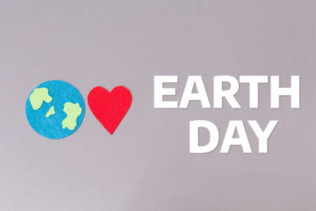 Earth Day. A felt-cut symbol of the planet earth and a red heart. Gray background with text. Flat lay. The concept of environmental protection.