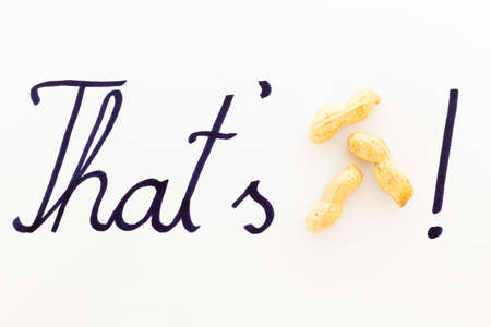 Concept of the saying that's peanuts! Raw unpeeled peanuts and black ink hand writing on white paper background