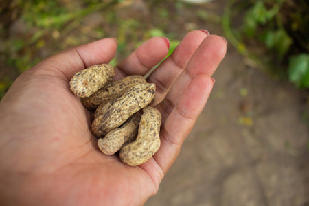 woman farmer hands holding harvest fresh ground peanuts. Perfect for themes related to agriculture and farming.