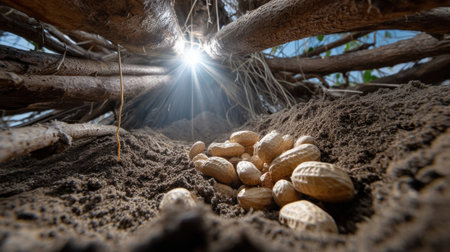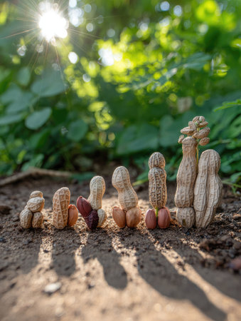 This image features a collection of peanuts arranged upright on a natural surface. The textured peanuts are in varying shades, suggesting different stages. The composition uses a low angle with sunlight filtering through lush greenery. Suitable for various editorial and commercial projects needing food or natural themes.