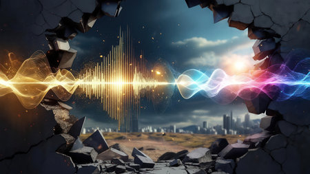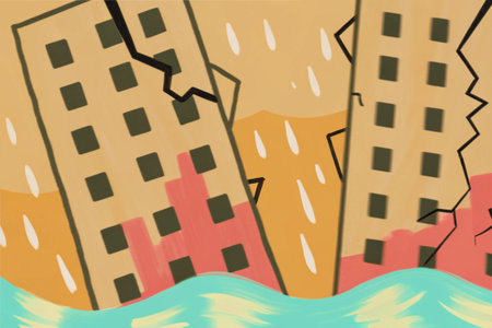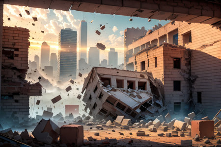 Amidst a cityscape, a building tilts dramatically, enveloped in a mix of vivid colors. Crumbled debris surrounds the structure, evoking the chaotic impact of an earthquake on urban life.