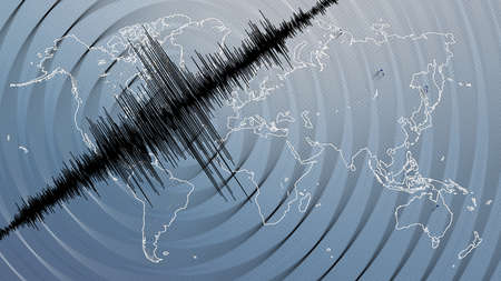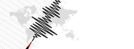 Earthquake concept with text and red curve wave and circle vibration on dark world map background vector illustration design