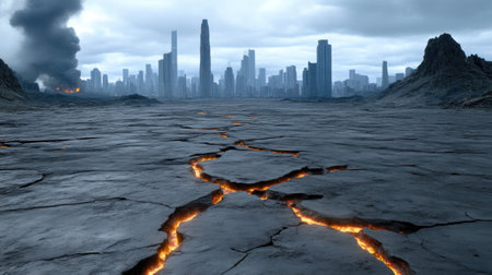 A striking urban scene captures the aftermath of a powerful earthquake, showcasing cracked roads and smoke billowing from distant fires, signaling urgency.