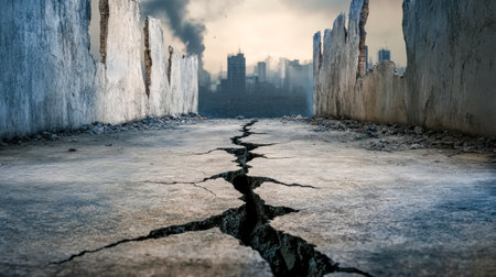 Deep cracks splitting asphalt roads after an earthquake, showcasing the immense power of seismic waves and the profound geological impact on the landscape