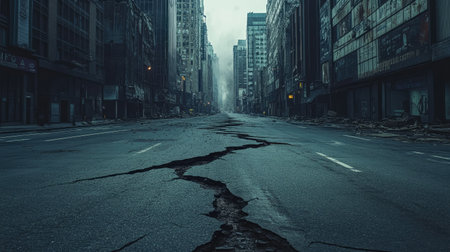 A haunting image of a deserted city street, with the crack in the road as the only sign of the earthquake.