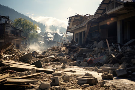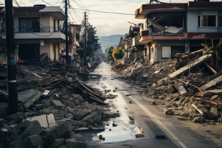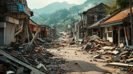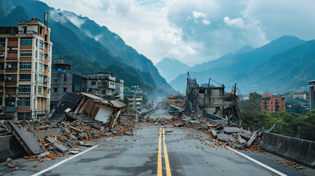 Earthquake Aftermath: Collapsed buildings and rubble-strewn streets following a major earthquake.Generated with AI