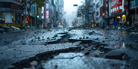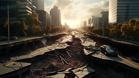 Capturing the Aftermath of an Earthquake: A Cracked Road in a Bustling City. Concept Natural Disaster, Urban Destruction, Earthquake Damage, City Resilience