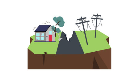 Realistic depiction of a suburban street split by an earthquake, highlighting the devastating impact on communities.