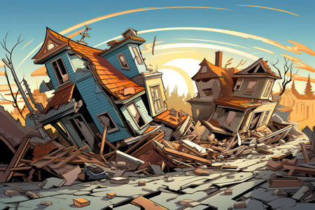 Destroyed houses after a powerful earthquake, city streets littered with stone and concrete, illustration