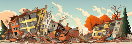 Destroyed houses after a powerful earthquake, city streets littered with stone and concrete, banner illustration