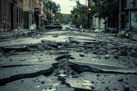 Streets littered with debris and cracked pavement --ar 3:2 Job ID: df4bc7f1-7687-4158-a405-732081aafab7