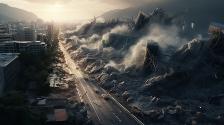 AI Generated. Devastated urban cityscape covered in dust and rubble after a massive destruction event
