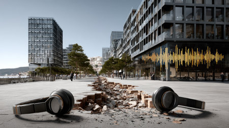 A striking urban landscape features cracked pavement with headphones, symbolizing the blend of sound and disruption in modern city life.