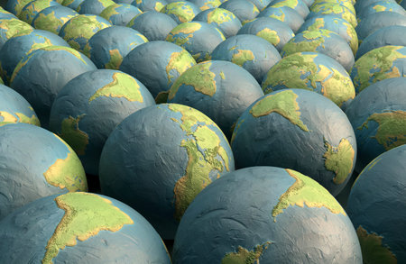 A closeup concept of a collection of earth globes made of rough clay - 3D render