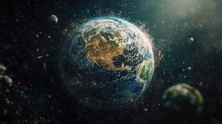 A captivating image of Earth viewed from space, showcasing its natural beauty surrounded by floating asteroids and cosmic debris, symbolizing exploration.