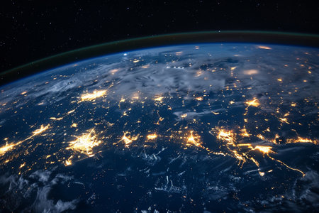 Night view of planet earth from space showing illuminated cities and stars