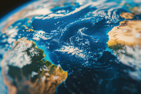 An artistic representation of Earth highlights the Americas. The image showcases a globe with vibrant blue and orange hues, suggesting a dynamic environment. The composition features a blend of textures, with light playing across the surface. This conceptual design may be suitable for various uses, including editorial and commercial projects.