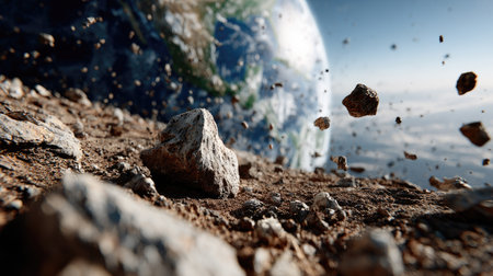 A captivating close-up view of asteroid debris orbiting Earth, showcasing the planet's surface and a dramatic cosmic backdrop, illustrating the vastness of space.