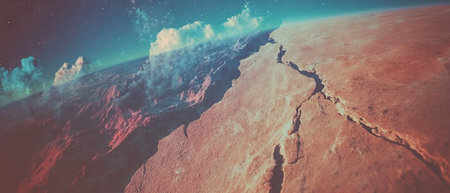 Exploration of cracked earth blending with a vibrant cosmic nebula in stunning double exposure