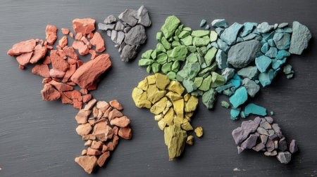 An artistic depiction of a colorful world map created from various stones and rocks, celebrating natural beauty and diversity in a unique presentation.