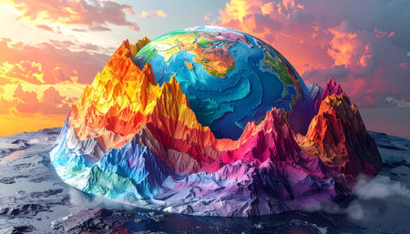 3D rendering of an abstract background with colorful mountains in the clouds