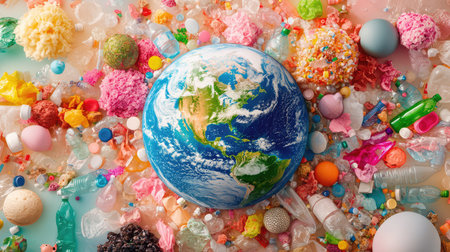 This image showcases a creative depiction of Planet Earth surrounded by vibrant plastic waste, highlighting urgent environmental challenges.