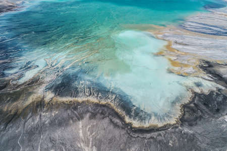 Top down aerial view over natural texture - abstract industrial lake water patterns. Turquoise waternature poluttion