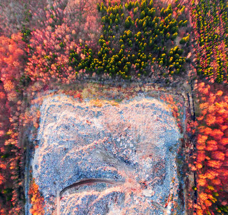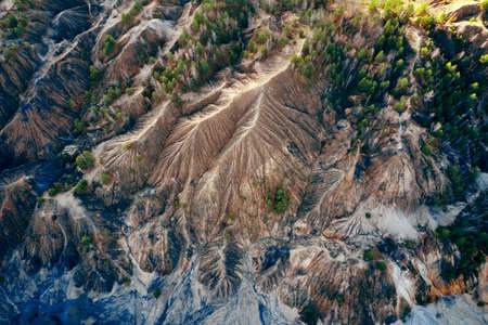 Aerial view of surrealistic industrial place. Human impact on the environment..Degraded landscape.Destroyed land.View from above.