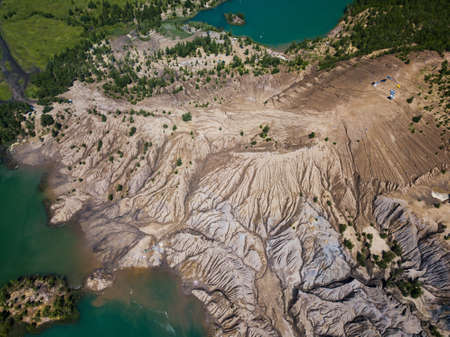 Degraded landscape. Destroyed land. View from above. Surrealistic lake.Human impact on the environment. View from above. Photo captured with drone