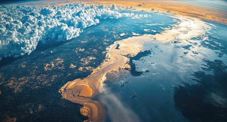 Stunning high-altitude aerial shot capturing a serene coastal river delta at golden hour. The panoramic view showcases a breathtaking interplay of cumulus clouds, tranquil waters, and diverse land textures. Perfect for travel, environmental, or geographical publications.