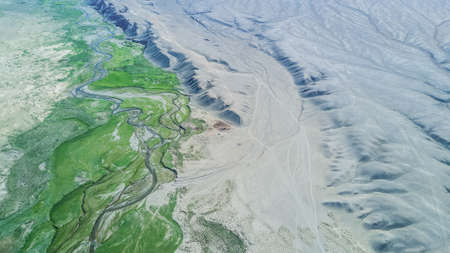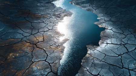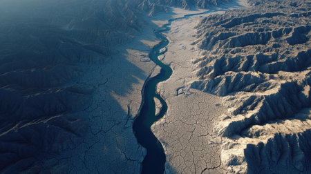 This stunning aerial photograph captures the intricate patterns of a cracked desert landscape, with a winding river flowing through the rugged mountain terrain.