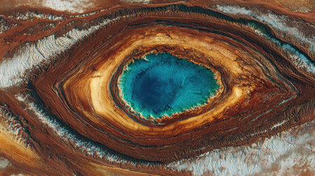 An aerial perspective showcases a vibrant mineral spring featuring concentric layers of color surrounding a central turquoise pool. The image displays earthy tones of brown, orange, and white, suggesting a geological formation. The composition and high angle imply possible uses in travel, nature, or environmental content.