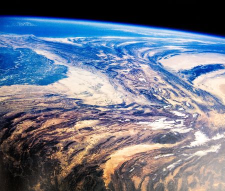 A stunning high-resolution image of the Earth's surface from orbit, with vibrant landmasses and deep blue oceans.