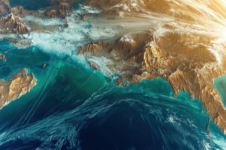 Geospatial aerial capturing of ocean shoreline contrasting with land textures for analysis and monitoring. Generative AI