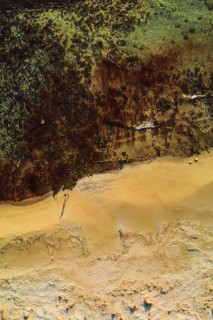 Top view of the dead salt sea edge near green grass, the beauty of nature. Shot. Aerial for green meadow near the dried natural reservoir.