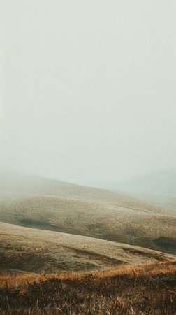 Distant mountain peaks are silhouetted against a hazy sky, creating a layered landscape of muted, soft tones and a sense of serene remoteness.