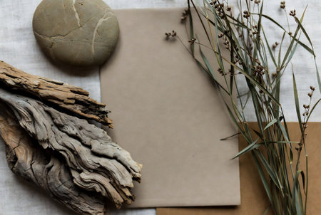 Minimalist flat lay composition featuring natural elements such as stones, ceramics, dried flowers, and organic materials arranged artfully on a neutral background.