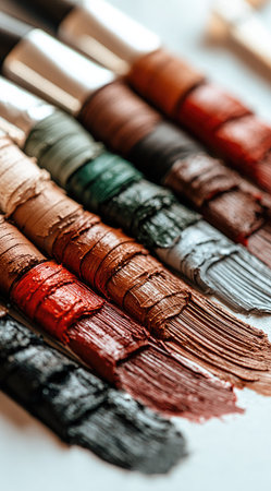 A close-up view displays paintbrushes with vibrant strokes of various colors. The image highlights texture and form of art supplies, presented against a white backdrop. The composition suggests artistic endeavors, suitable for promotional materials or editorial content related to art and creativity.