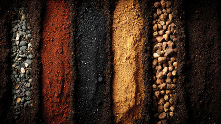 High-quality image illustrating various soil layers and textures, showcasing a spectrum of colors and granular materials essential for understanding agriculture and gardening.