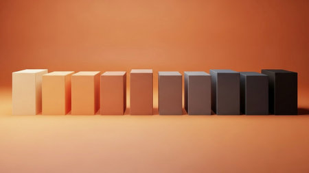 Ten evenly spaced rectangular blocks arranged in a horizontal row transitioning in color from light beige to dark brown against a smooth warm orange background creating a gradient effect with...