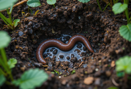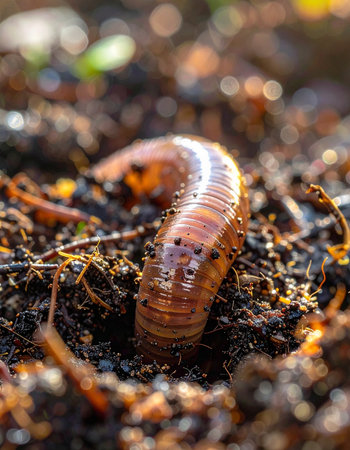 Close-up macro shot of an earthworm on wet soil with water droplets Detailed texture natural lighting ecological and biological concept