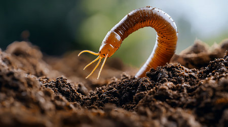 In a detailed close-up, a curious orange soil centipede arches from the rich ground, its delicate antennae sensing the world above. Soft light illuminates its translucent body.
