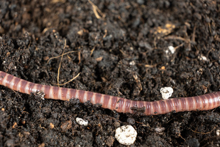 In a detailed macro view, a common earthworm diligently works its way through rich, dark compost.