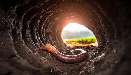 Common earthworm in underground tunnel, light coming from outside. AI generated image