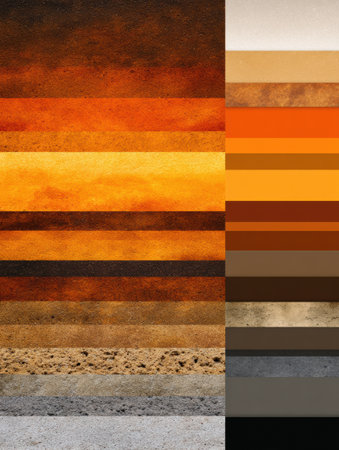 Various textured horizontal stripes exhibit a stunning gradient of orange, brown, and neutral colors, demonstrating a rich palette of warm hues.