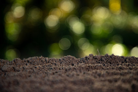 The ground features dark brown soil mixed with small rocks and organic materials, illuminated by natural sunlight, showcasing a rich texture ideal for gardening or farming.