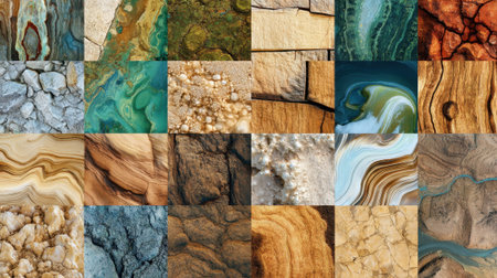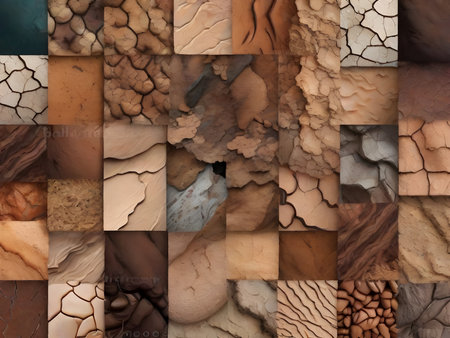 Collage showcasing a collection of 16 individual blocks featuring diverse textures and materials, including cracked earth, aged wood, and rough stone surfaces, creating visual contrast.