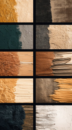 This image presents a close-up view of multiple paint strokes, showcasing a diverse range of colors and textures. The composition employs a grid-like structure with each section displaying a unique brushstroke, highlighting details in the surface. This creates a versatile visual for various commercial and editorial applications.