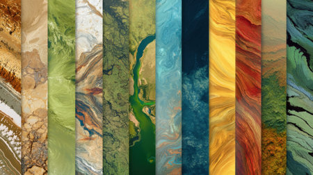 Abstract aerial landscapes featuring diverse textures and vibrant colors.
