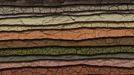 Horizontal layers of cracked earth and soil in various shades of brown beige orange green and grey.